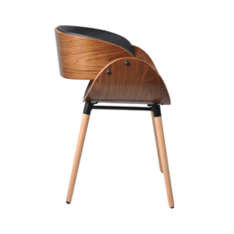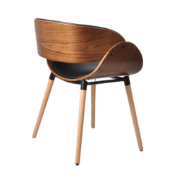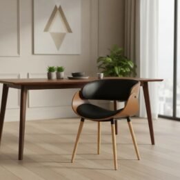 Con una estructura robusta de madera y un tapizado en eco cuero negro, esta silla combina durabilidad y estilo, adaptándose a cualquier ambiente contemporáneo.