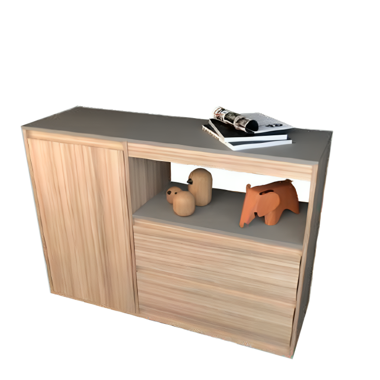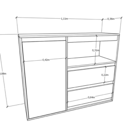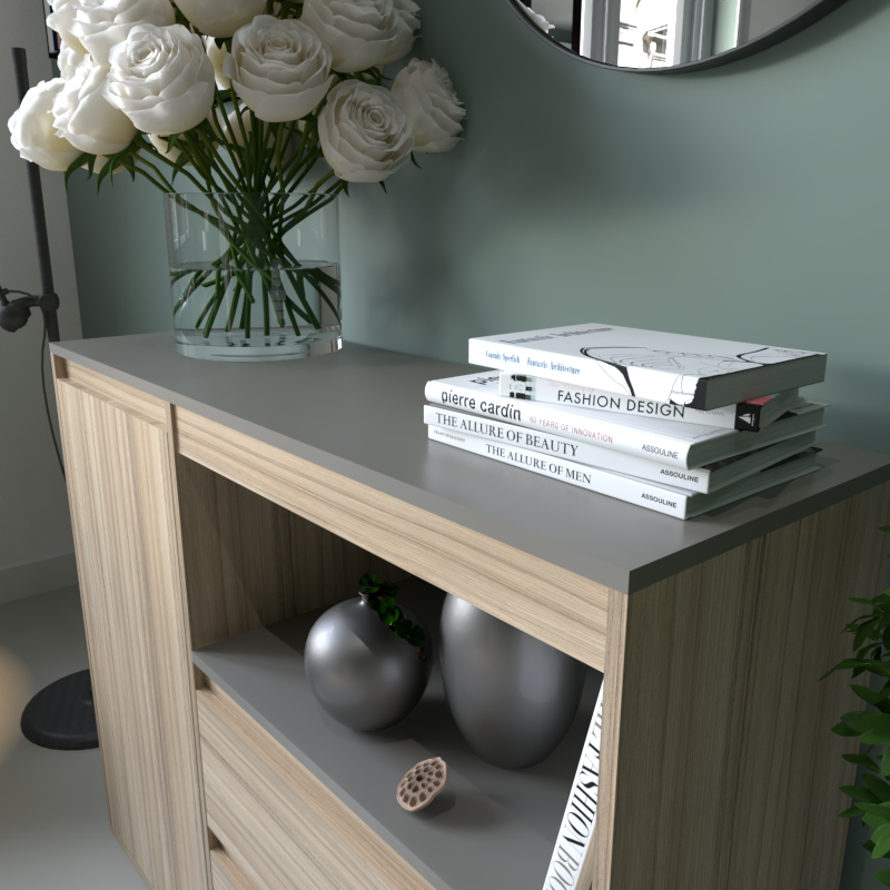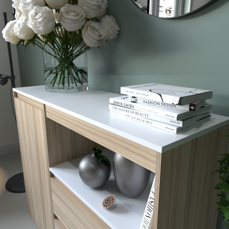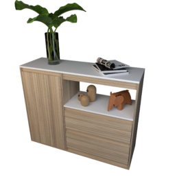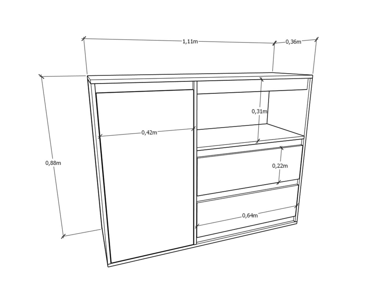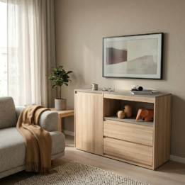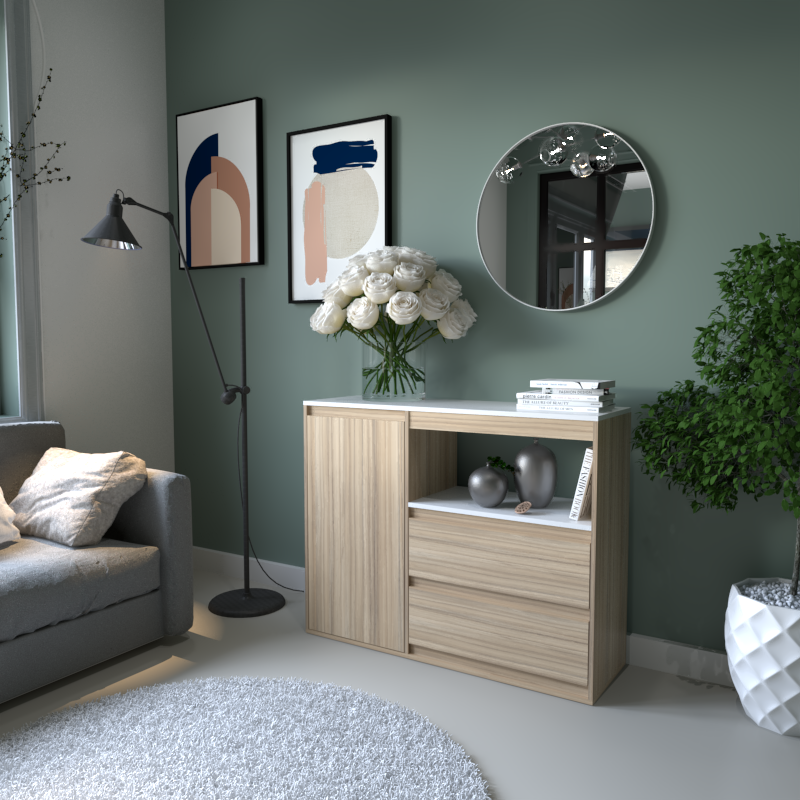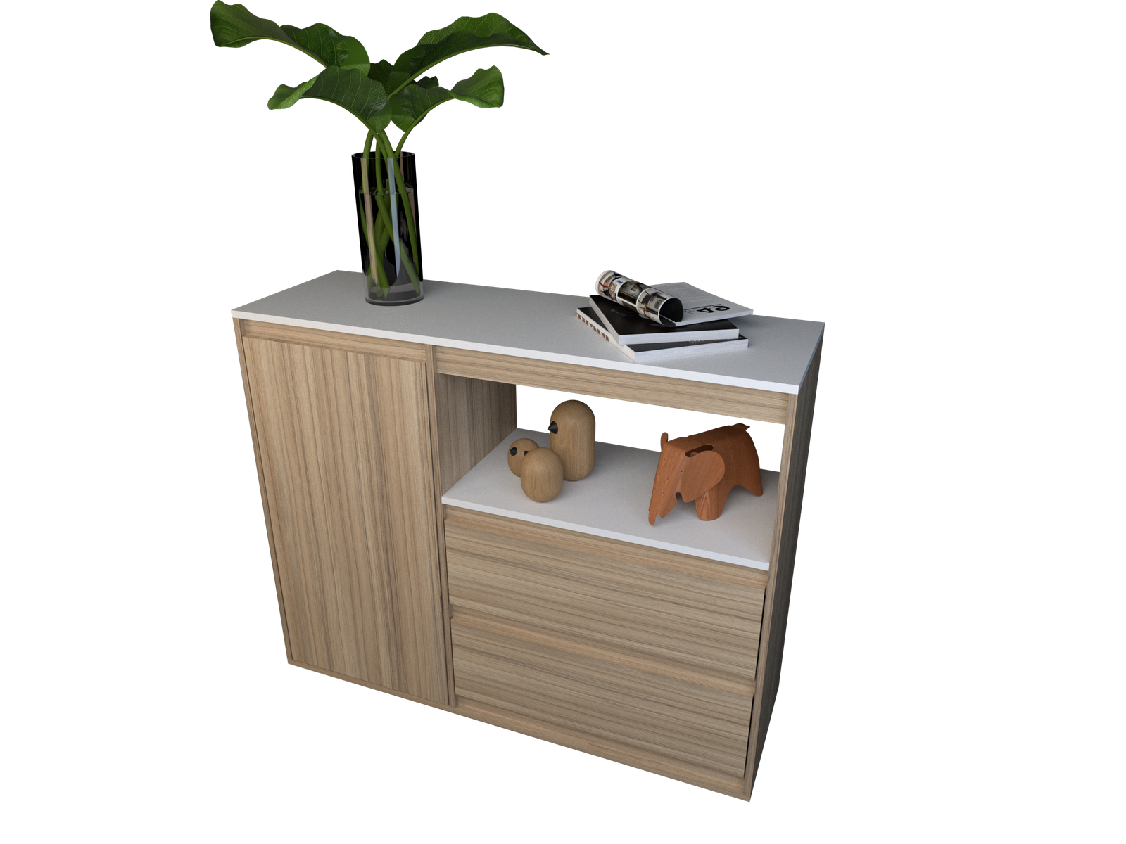 Este modelo cuenta con dos cajones y una puerta, ofreciendo un amplio espacio para organizar su vajilla y otros objetos. La melamina de alta calidad garantiza durabilidad y resistencia, mientras que las correderas aseguran un uso suave y cómodo.