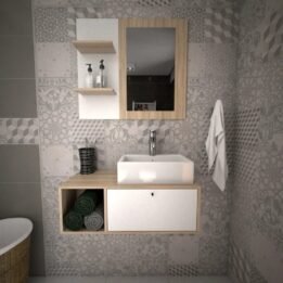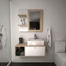 Con dos estantes, proporciona el espacio ideal para organizar tus productos de higiene y belleza, manteniéndolos siempre al alcance. El espejo integrado añade una capa de funcionalidad, permitiendo que te prepares cada día con comodidad y estilo.