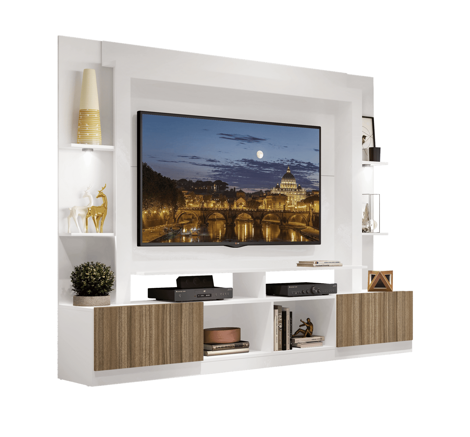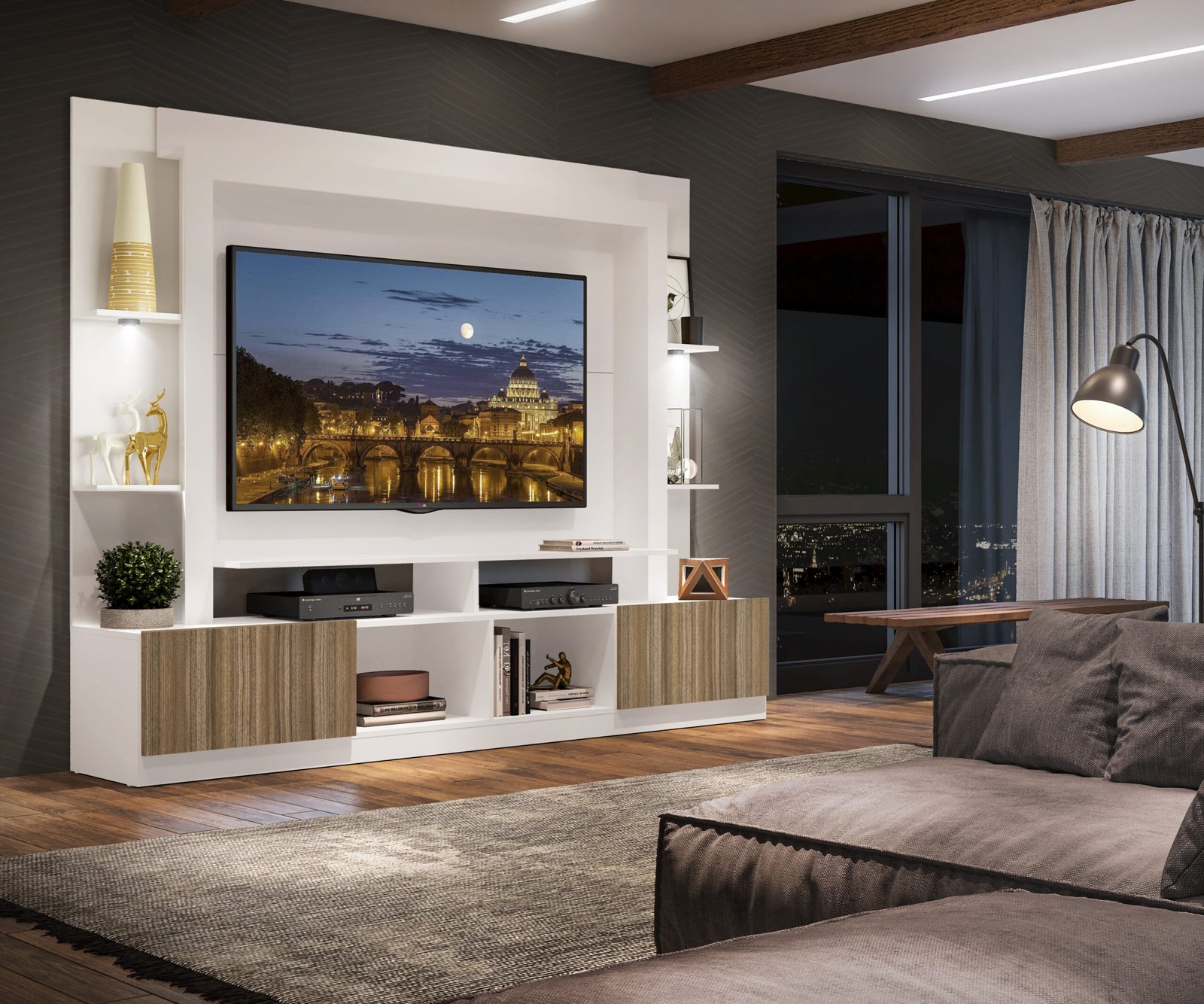 Con un ancho de 213 cm, profundidad de 38 cm y altura de 171 cm, es ideal para televisores de hasta 65 pulgadas, convirtiéndose en el centro de atención de tu hogar.