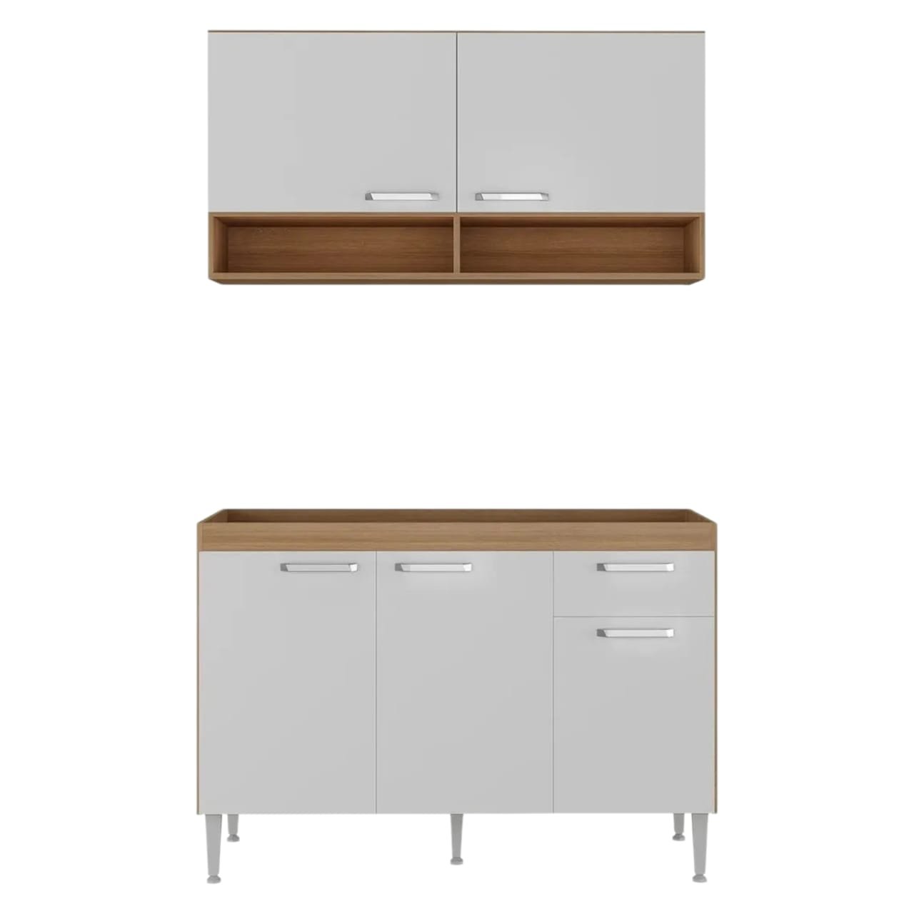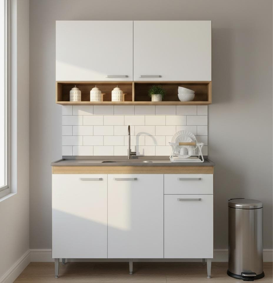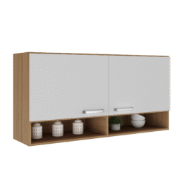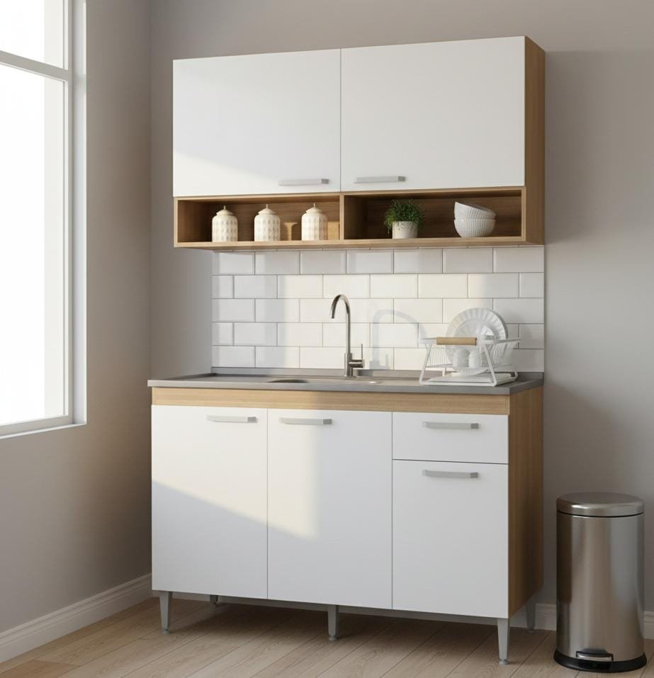 El combo incluye una alacena de 60 cm de alto y 120 cm de ancho, con estantes que ofrecen un amplio espacio de almacenamiento.