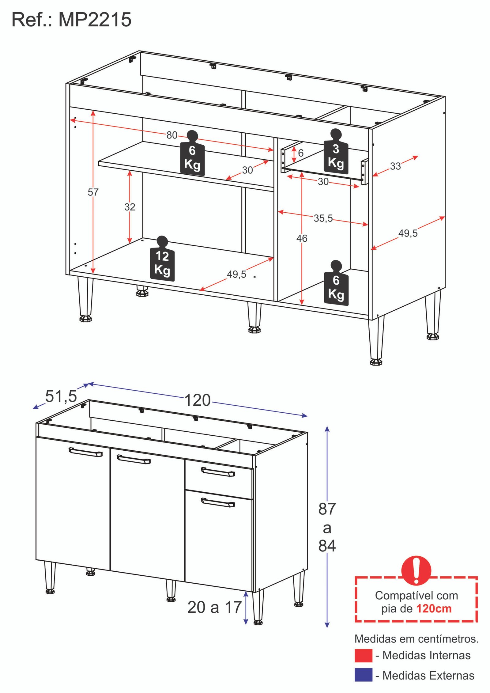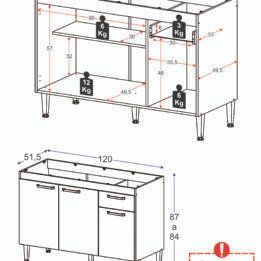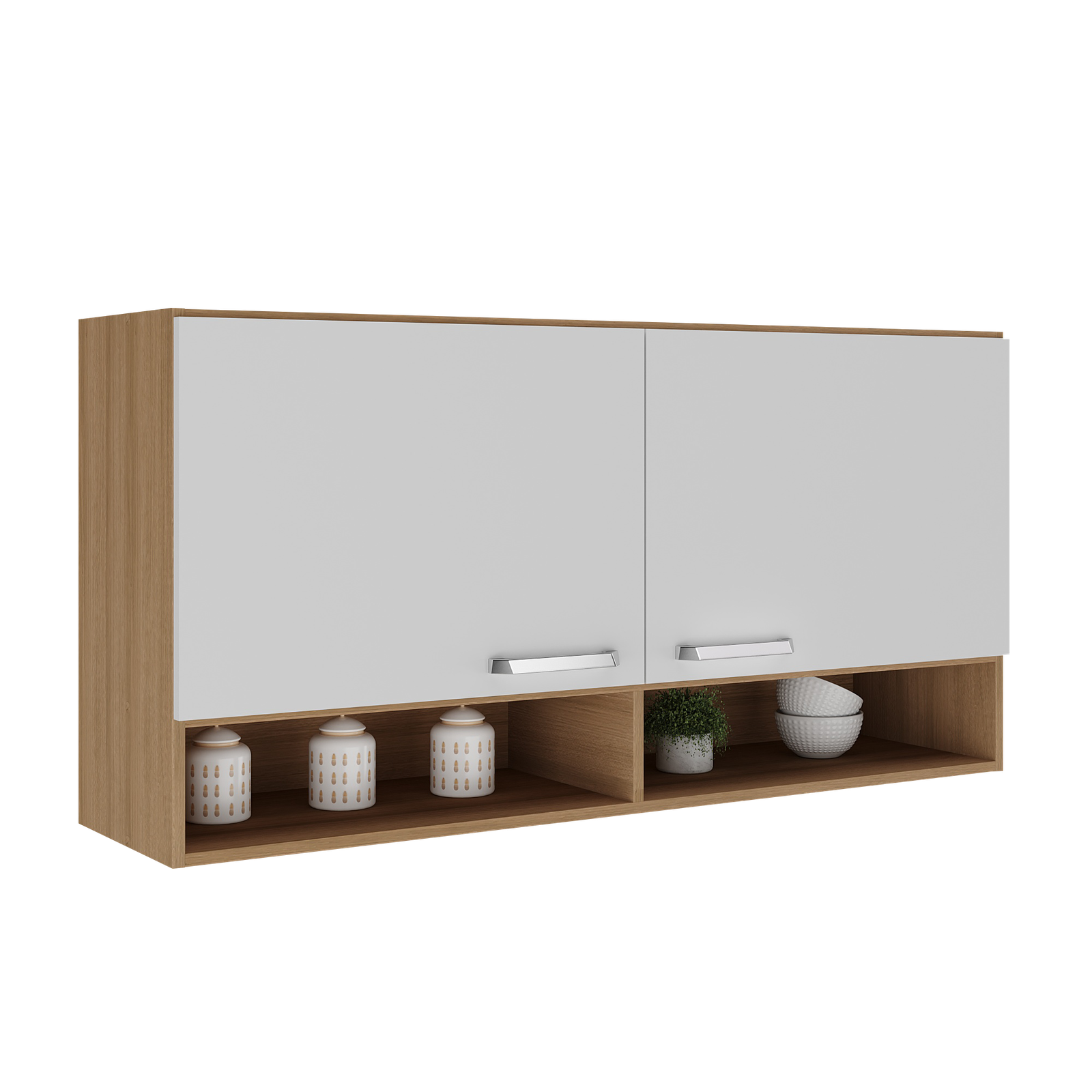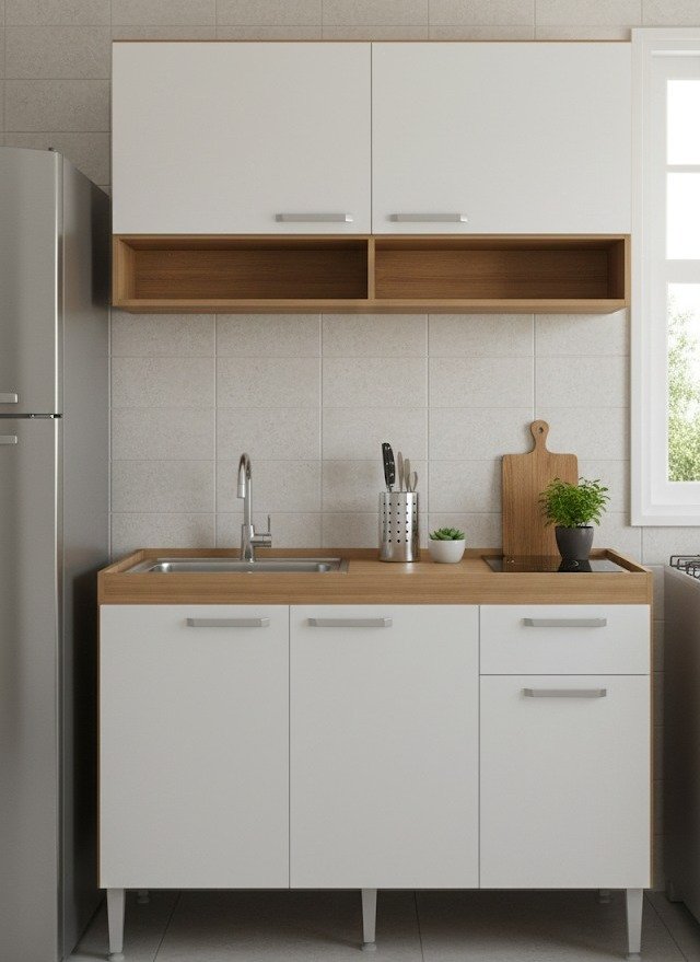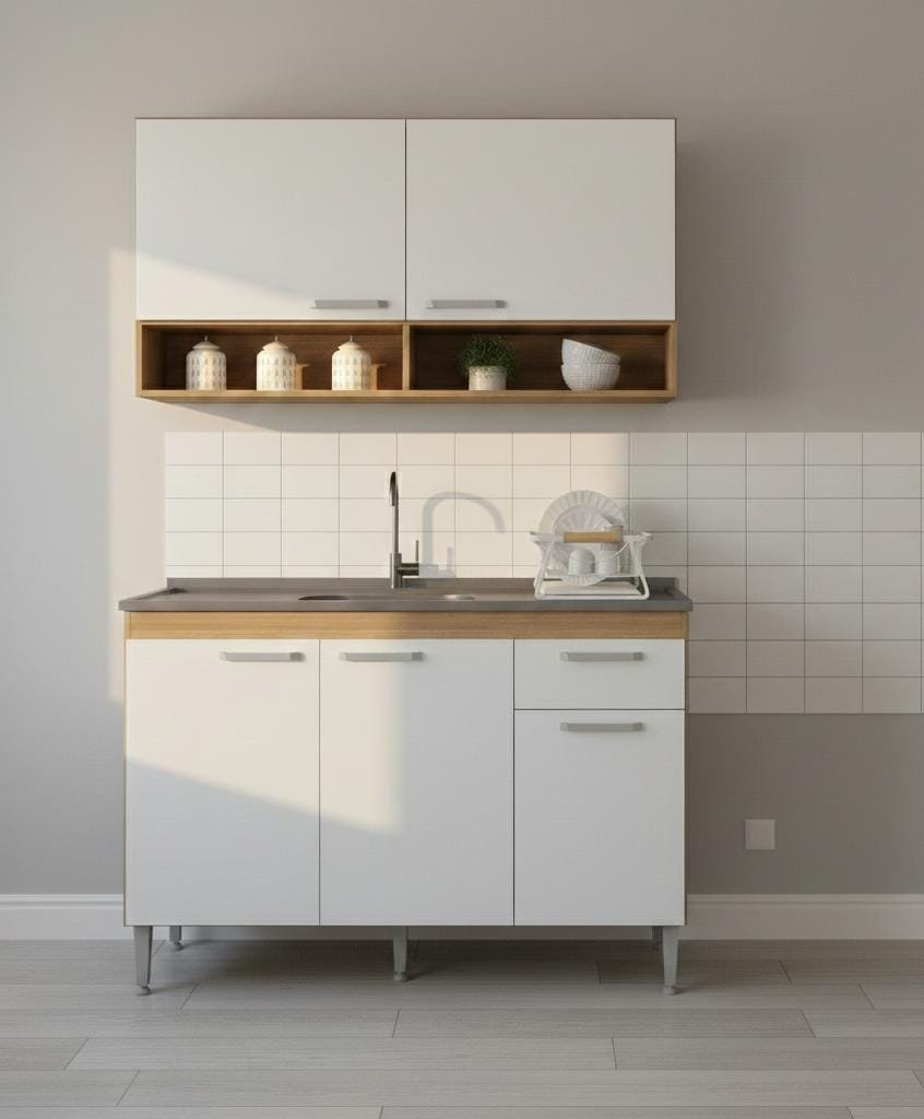 El combo incluye una alacena de 60 cm de alto y 120 cm de ancho, con estantes que ofrecen un amplio espacio de almacenamiento.