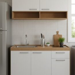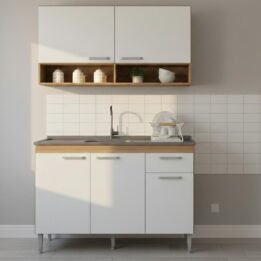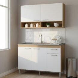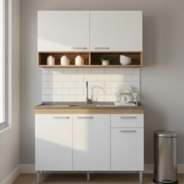 Este conjunto de muebles de cocina combina funcionalidad y estilo moderno, ideal para quienes buscan optimizar el espacio sin sacrificar la estética.