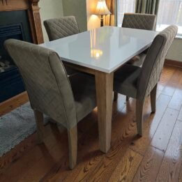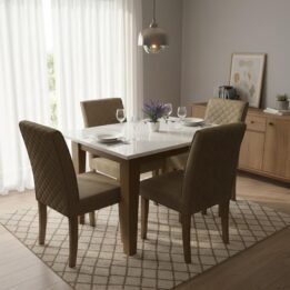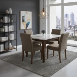 El conjunto incluye cuatro sillas tapizadas que ofrecen un confort excepcional, asegurando que todos se sientan bienvenidos en la mesa.
