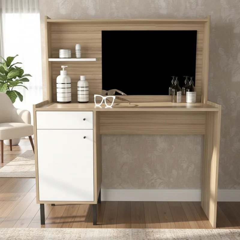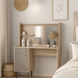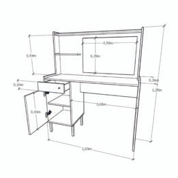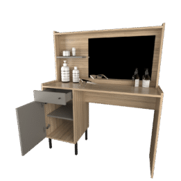 Con unas dimensiones de 103 cm de ancho, 129 cm de altura y 38 cm de profundidad, este tocador proporciona un amplio espacio para tus productos de maquillaje y accesorios. Su cajón y puerta permite mantener todo organizado y al alcance de la mano, mientras que el espejo integrado añade un toque práctico y sofisticado.