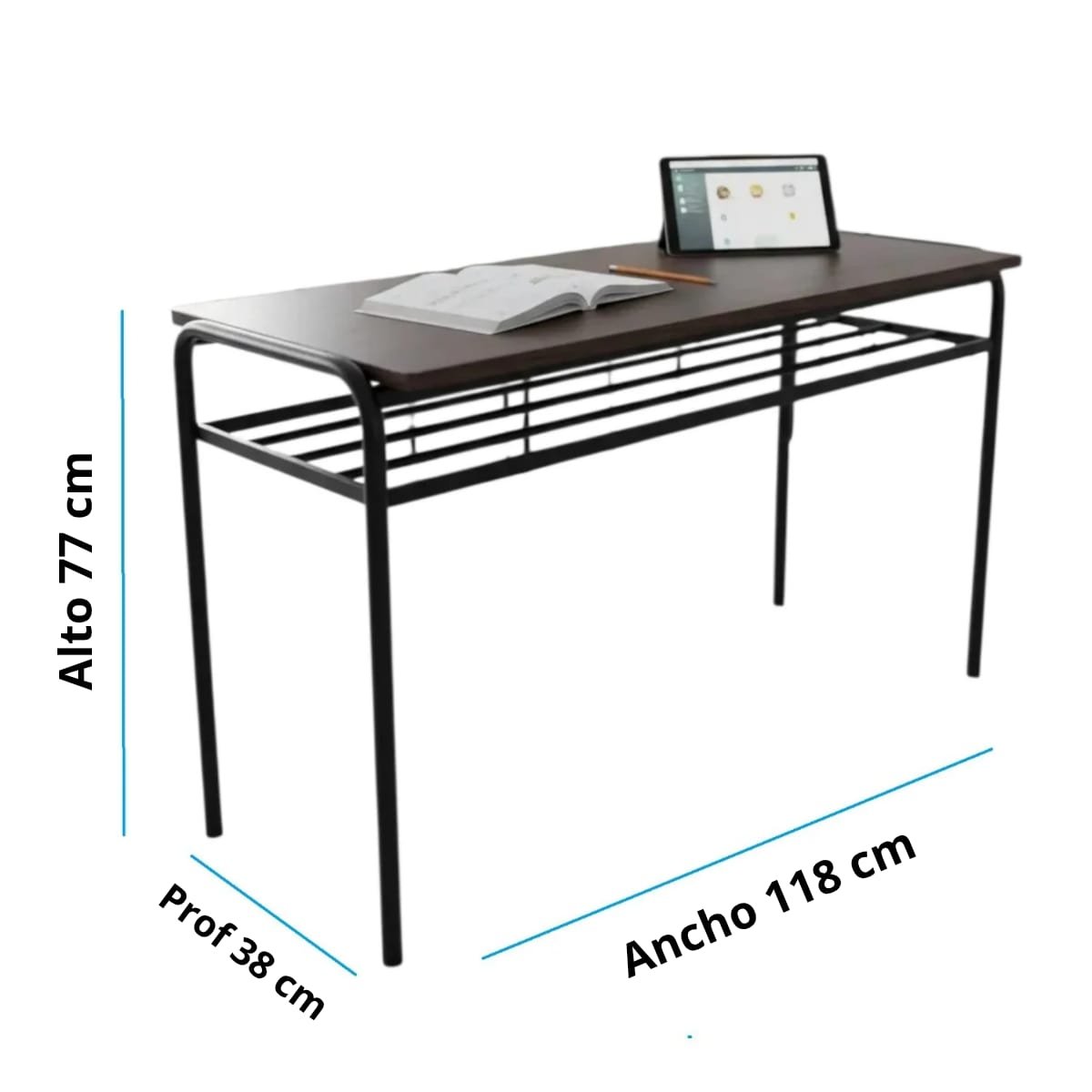 Con unas dimensiones de 118 cm de ancho, 38 cm de largo y 77 cm de altura, este pupitre proporciona un amplio espacio para trabajar cómodamente. Además, cuenta con un compartimento para libros, lo que facilita la organización de materiales y documentos.
