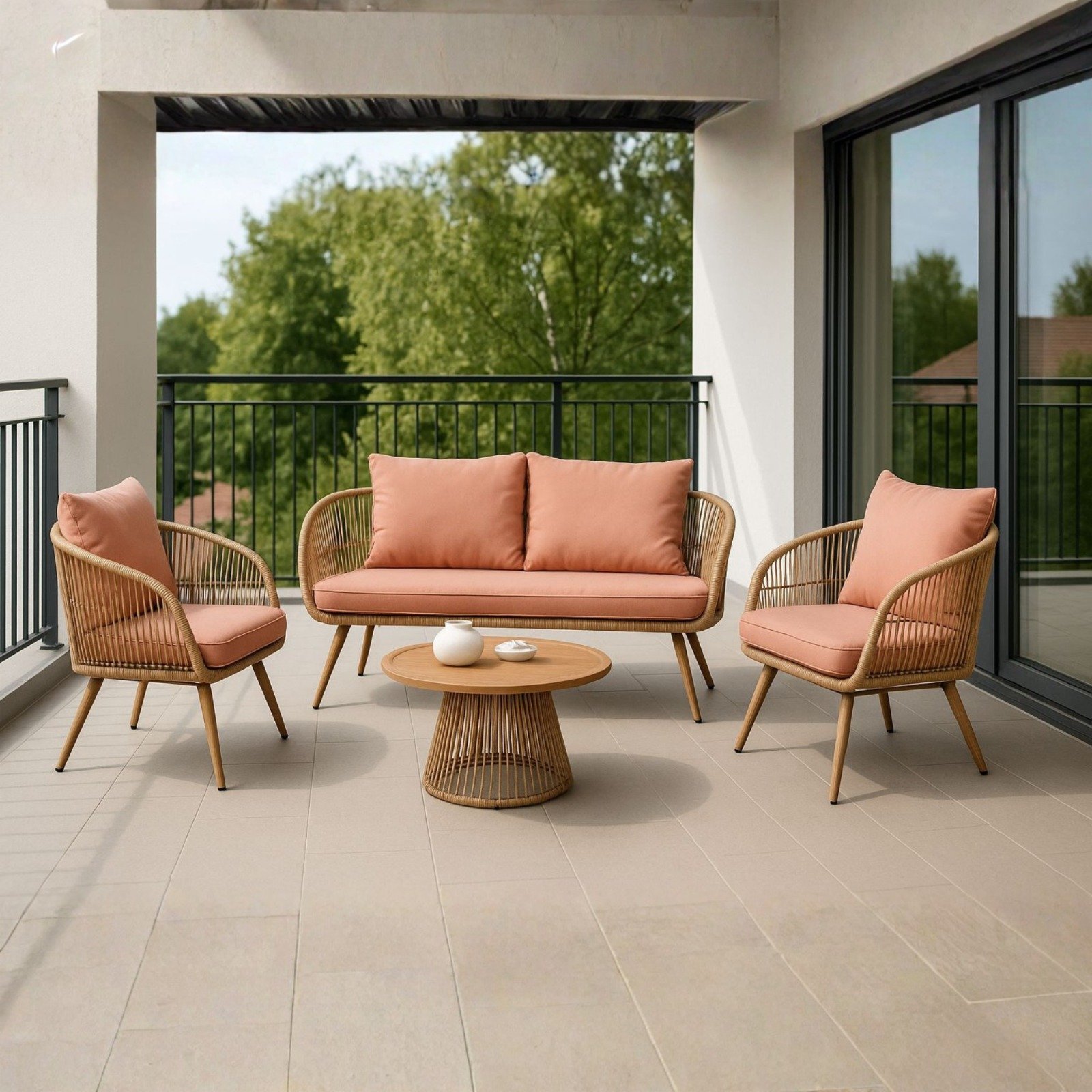 Este conjunto está diseñado para ofrecer comodidad y estilo, ideal para disfrutar de momentos al aire libre con amigos y familiares. Con tres sillones de ratán, cada pieza combina elegancia y funcionalidad, creando un ambiente acogedor en tu jardín o terraza.
