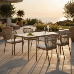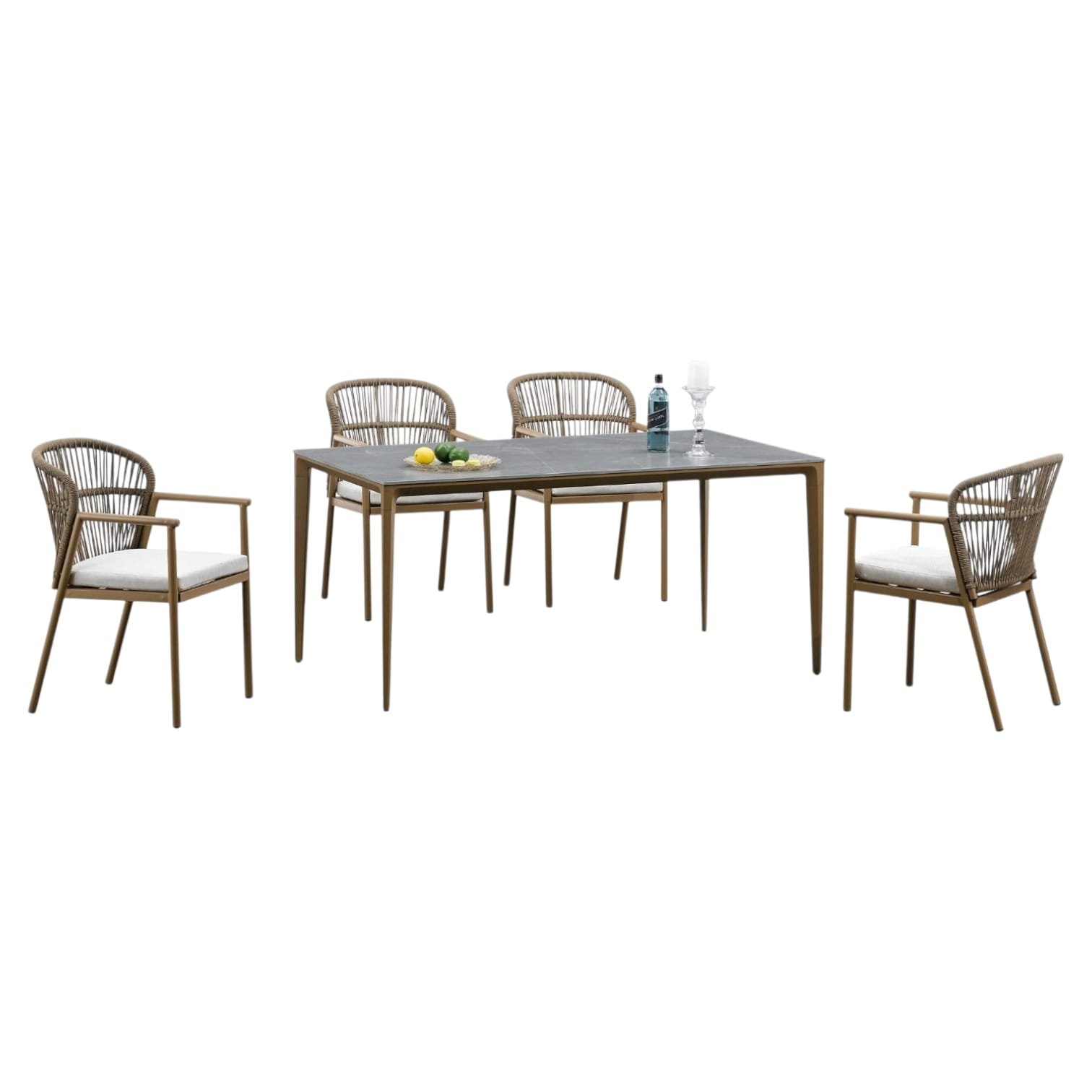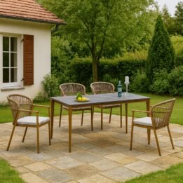 Con unas dimensiones de 160×90 cm, la mesa ofrece un amplio espacio para compartir comidas y conversaciones, mientras que las sillas brindan comodidad y estilo.