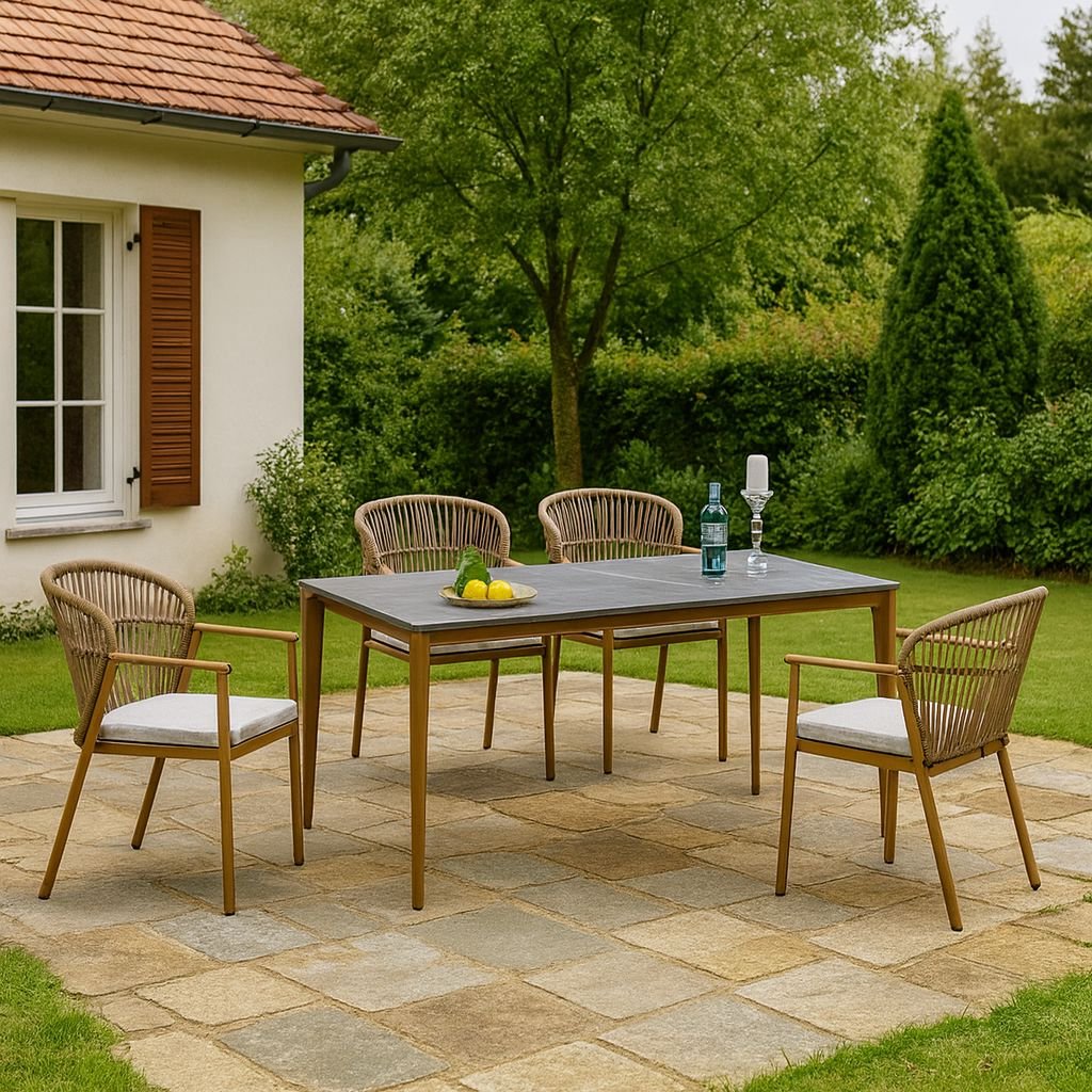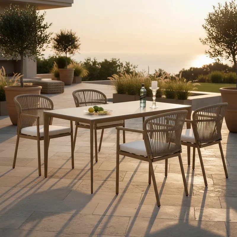 Transforma tu espacio exterior con el Set Marbella, una elegante combinación de mesa rectangular y cuatro sillas de ratán, ideal para disfrutar de momentos inolvidables en tu jardín.