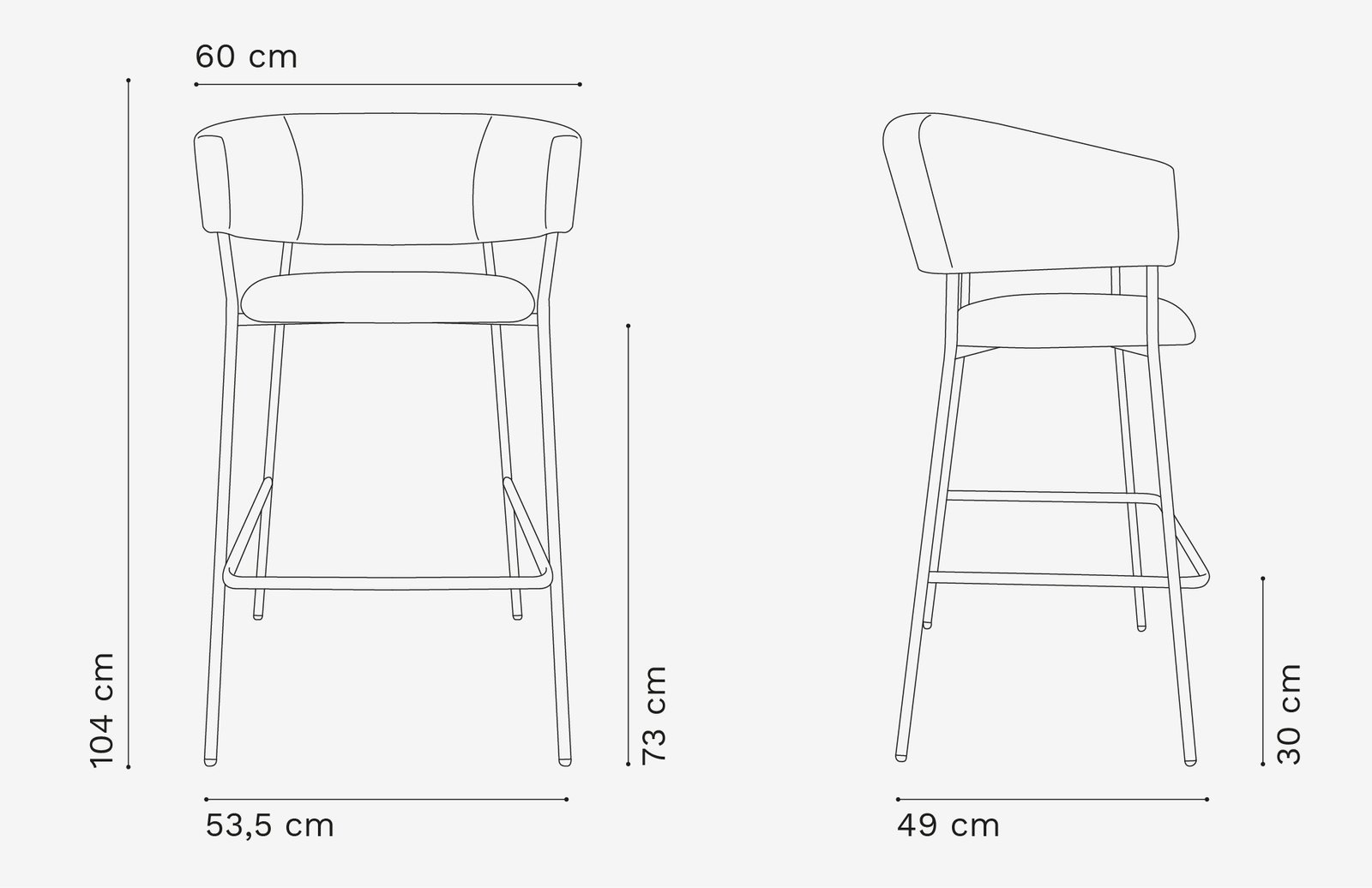 Con una altura máxima de 104 cm y un diseño robusto, este taburete ofrece comodidad y soporte, ideal para barras y cocinas modernas.